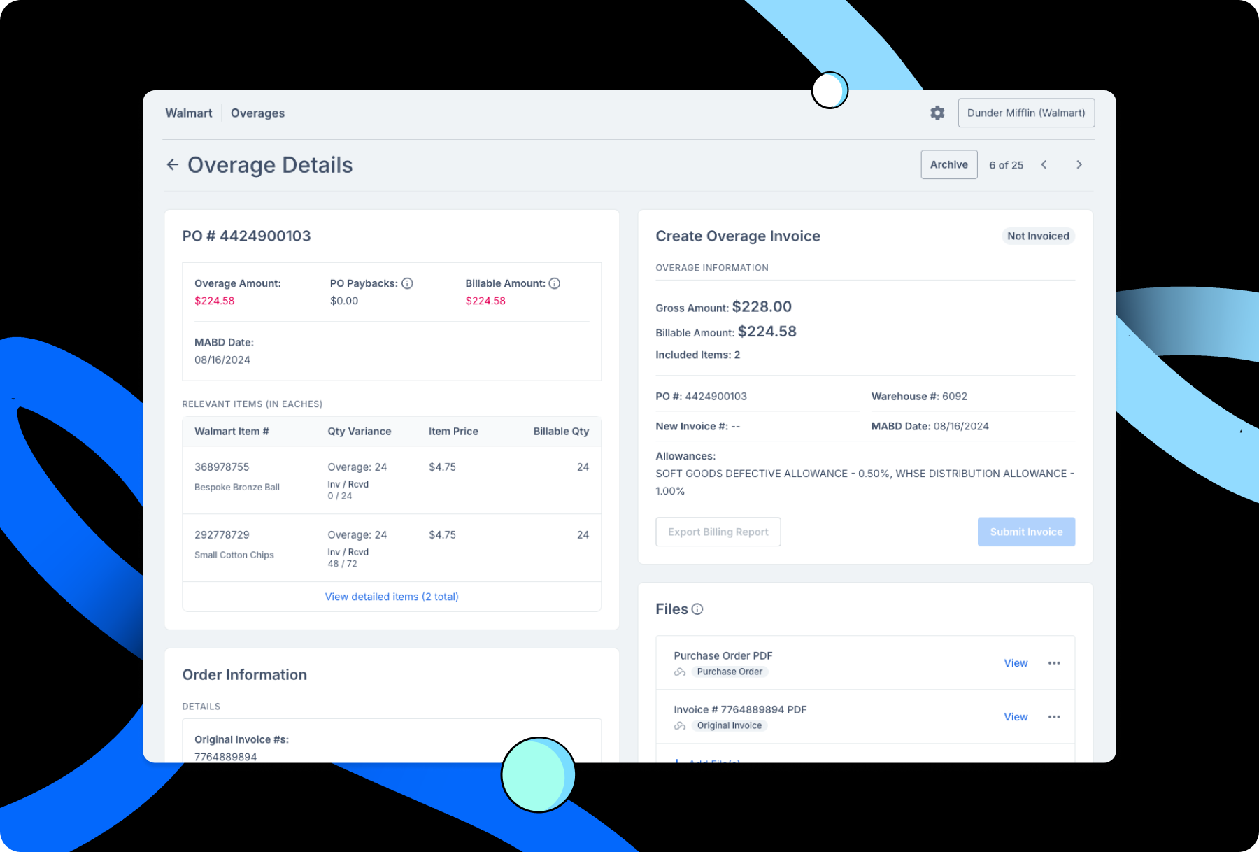 - Overage invoice information. View details around the overage opportunity status as well as how much was invoiced, paid, and deducted. Similar to the original invoice shortage deductions, we’ll show related deductions that might have been taken from the overage invoice for easy review.